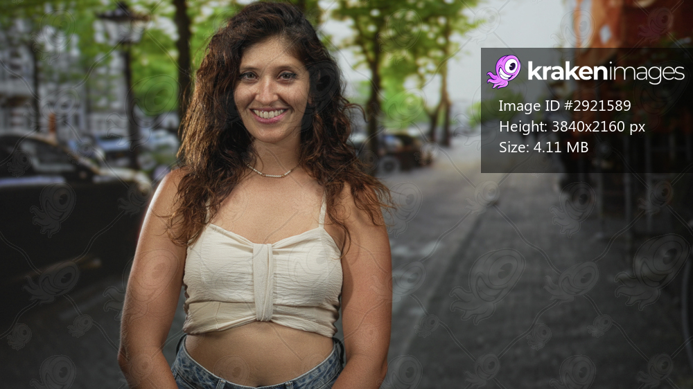 Woman shows midriff and smiles while looking up on an urban street lined with trees and parked cars; joyful optimism.