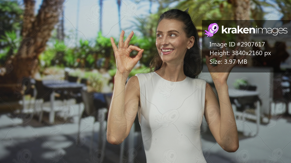 Woman shows ok sign with both hands and fingertip detail by restaurant table on street; joy approval.