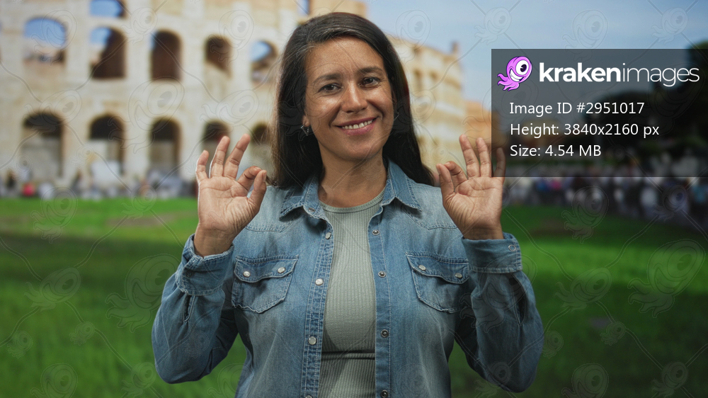 Woman shows ok sign with both hands in front of a historic building, smiling in a denim jacket and green top; travel joy.