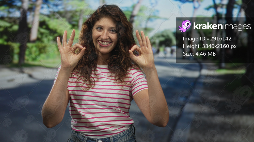 Woman shows ok sign with both hands on a tree lined street in a green park wearing pink striped t shirt and denim jeans; joyful optimism.