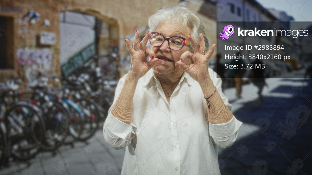 Woman shows ok sign with hands and colorful glasses on a city street lined with parked bicycles and old buildings; joyful independence.