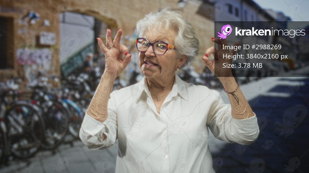 Woman shows ok sign with hands and colorful glasses on a city street lined with parked bicycles and old buildings; joyful independence.