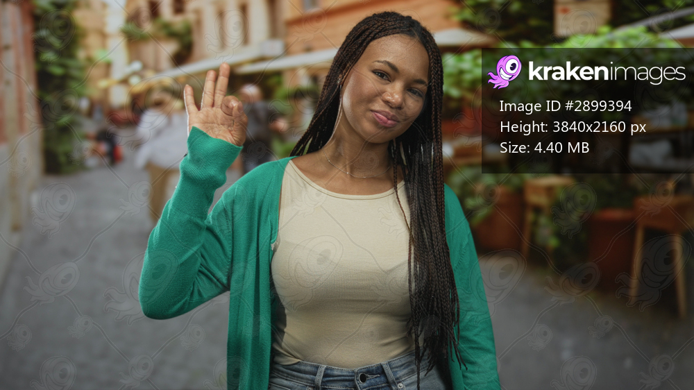Woman shows ok sign with right hand and casual smile while standing on a cobblestone street outside a cafe lined with plants and tables; confidence approval. - Kraken Images