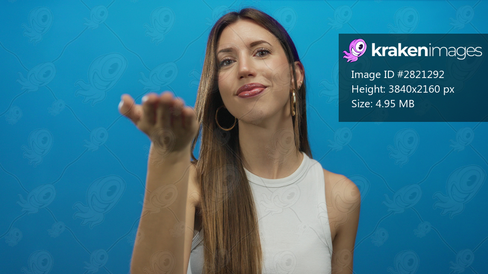 Woman shows open hand and smiles with her face and gold earrings in blue studio; invitation connection trust warmth.