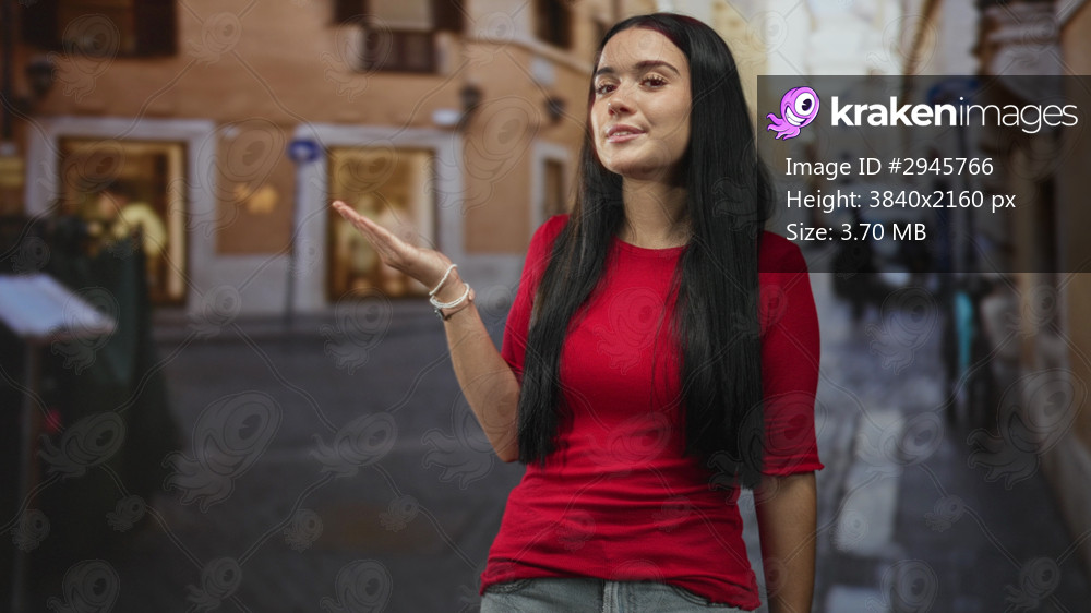 Woman shows open palm gesture on a cobblestone street wearing a red top and bracelet with long black hair and a smiling face; joy travel.