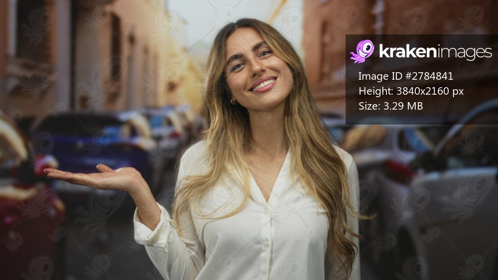 Woman shows open palm on sunlit urban street with parked cars along brick walls; openness warmth invitation.