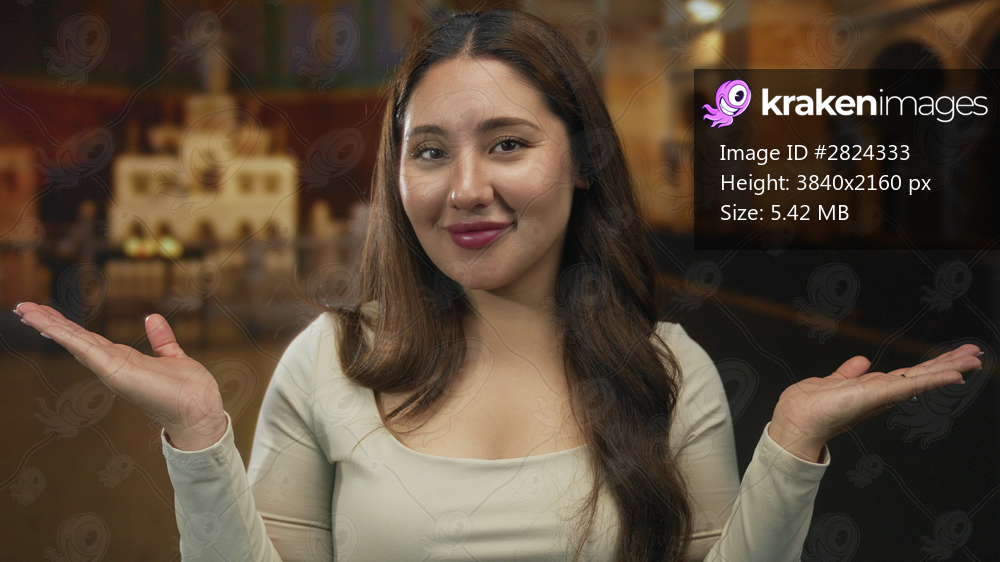 Woman shows open palms and a slight smile under warm golden light inside a large church building; serenity.