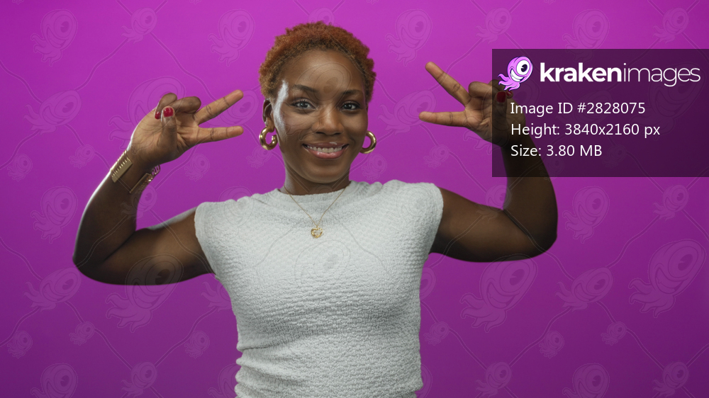 Woman shows peace sign with both hands in a purple studio environment, wearing white top and gold jewelry; serenity.