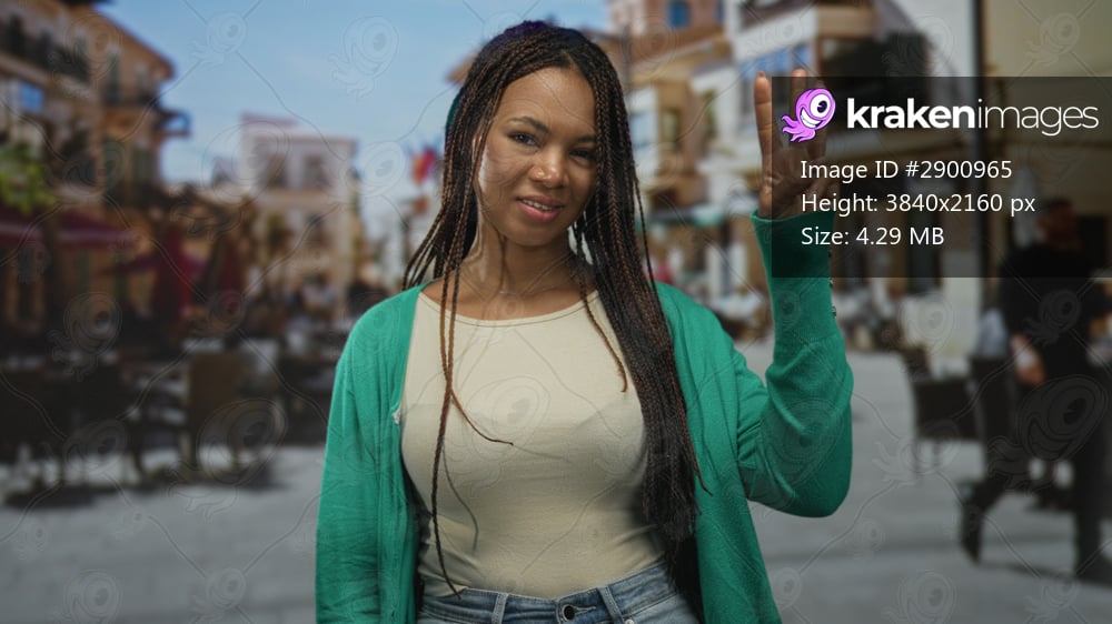 Woman shows peace sign with raised hand and visible finger gesture on street cafe promenade wearing casual top and green cardigan; confidence optimism. - Kraken Images