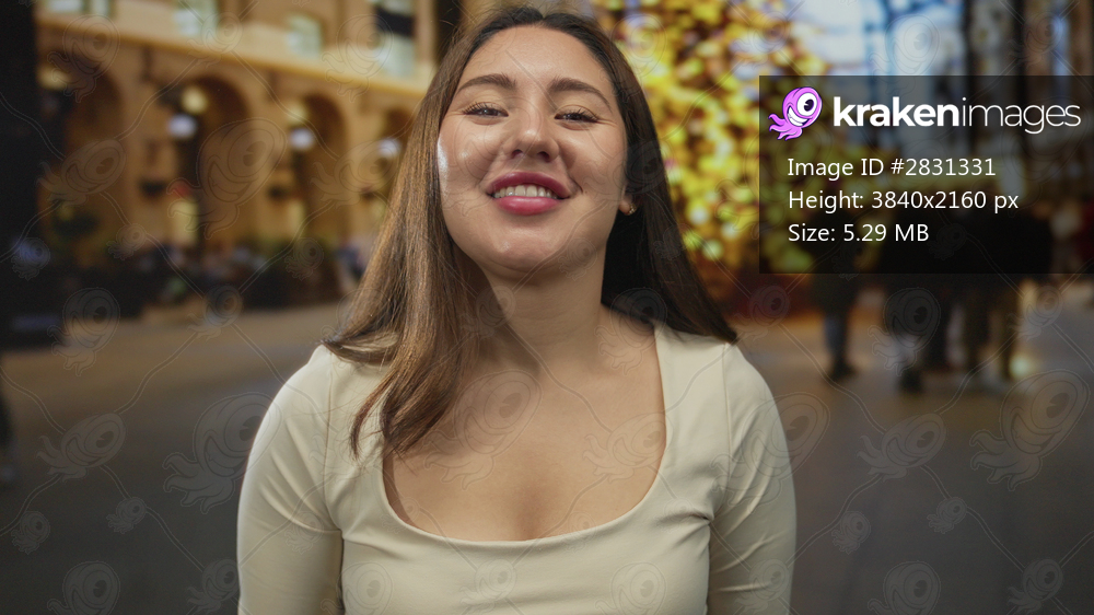 Woman shows rock horns with hands on urban street under golden lights near blurred crowd in evening; fun.