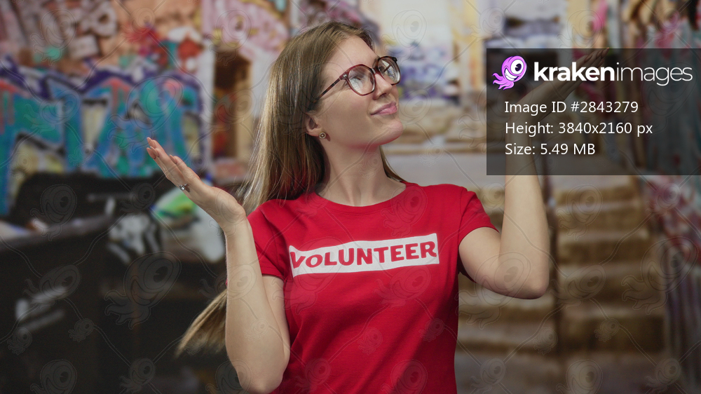 Woman shows shrug gesture with hands palms up on street with graffiti walls; uncertainty doubt curiosity questioning.