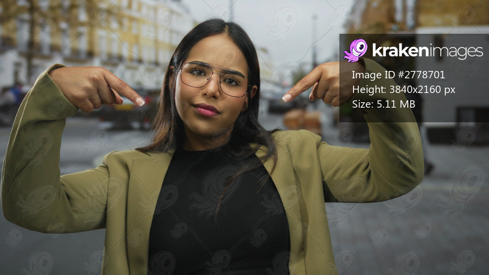Woman shows thumb in disapproval on street as a young latin hispanic person stands outdoors pointing toward urban architecture.