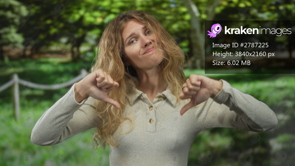 Woman shows thumb in thumbsdown pose in a park with a blonde young performer giving a smile gesture of disapproval in nature.