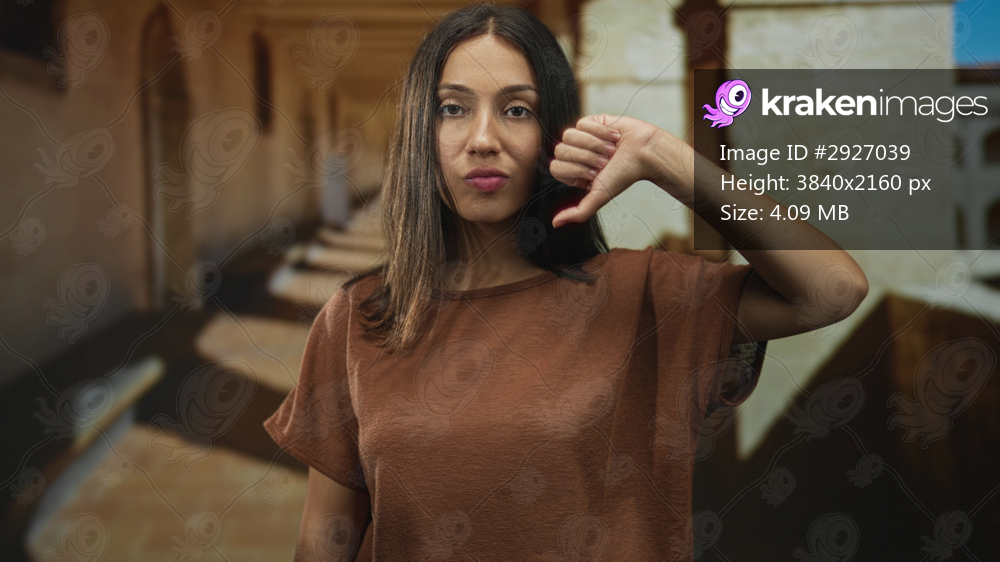 Woman shows thumbs down gesture on an old street with stone building behind her; critique disapproval.