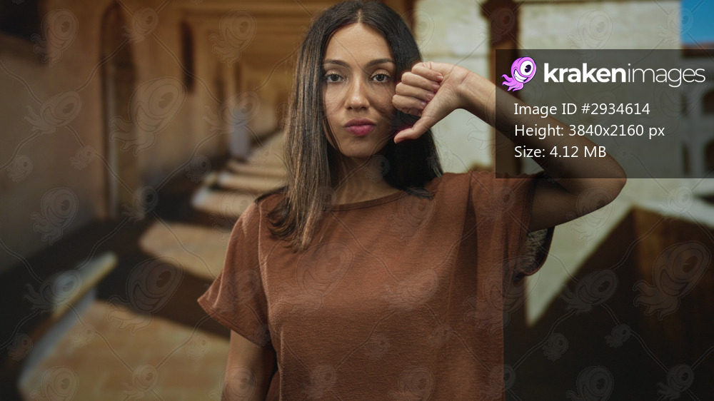 Woman shows thumbs down gesture on an old street with stone building behind her; critique disapproval.