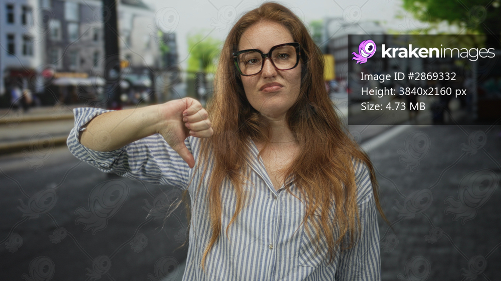 Woman shows thumbs down gesture on street lined with buildings and tram tracks during rush hour; social criticism disapproval.