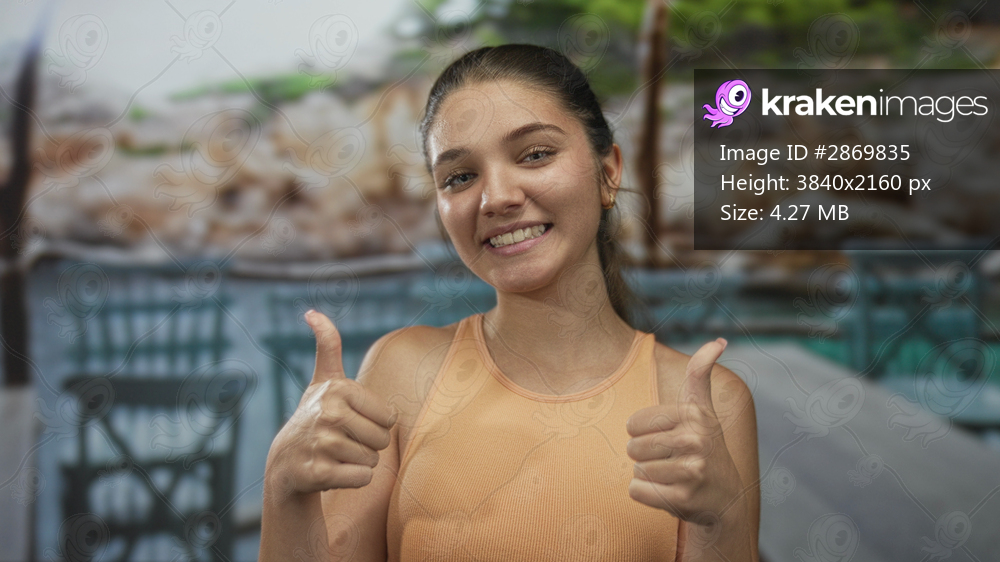 Woman shows thumbs up gesture at outdoor restaurant terrace wearing sleeveless top, smiling to camera; friendly approval joy.