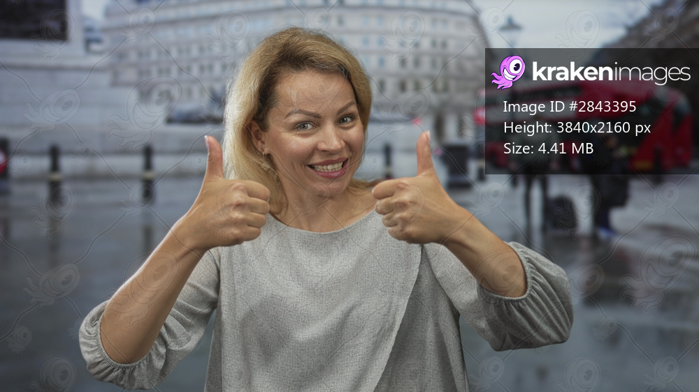 Woman shows thumbs up gesture on rainy city street with wet pavement and red bus behind her; approval.