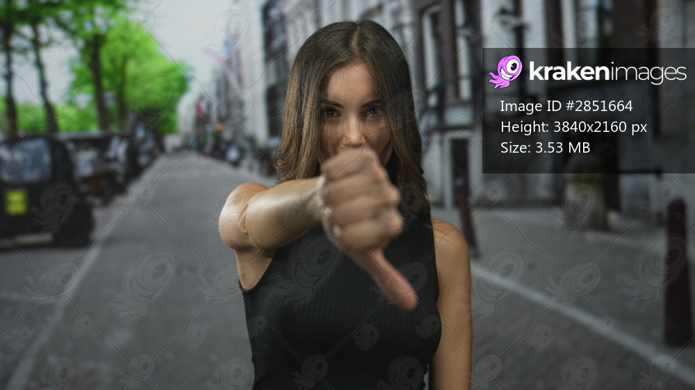 Woman shows thumbs up then thumbs down on street in urban city scene amid parked cars and buildings; indecision.