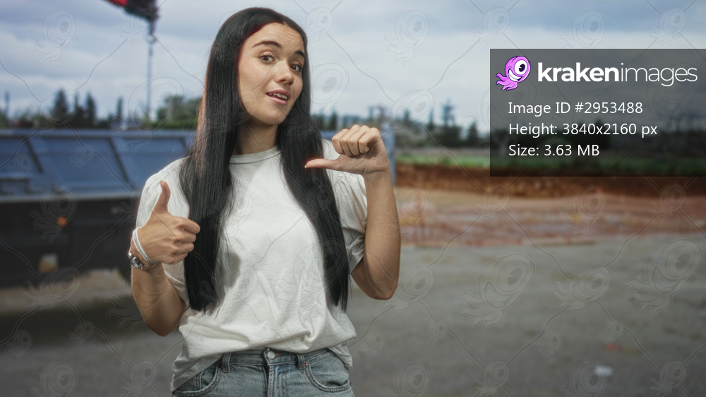 Woman shows thumbs up and thumb pointing to chest on a street near a construction truck and dirt lot; playful confidence.