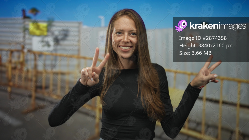 Woman shows two finger peace sign with both hands in front of construction site metal barrier while smiling broadly at camera; peace joy.