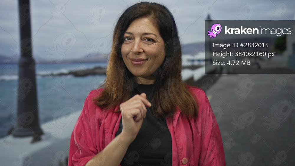 Woman shows warm face and smile wearing pink jacket on seaside promenade with ocean wall railing; serenity calm.