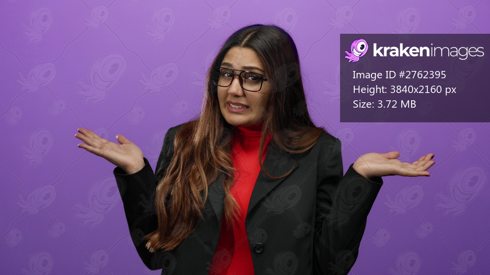 Woman shrugging with confused expression in business attire against vibrant purple background
