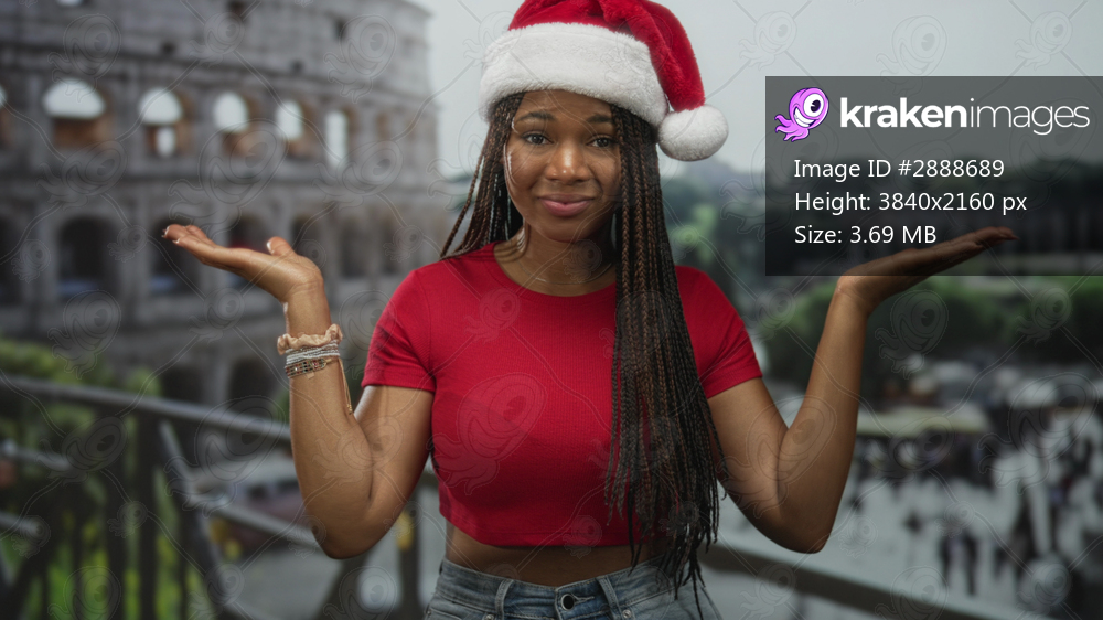 Woman shrugging hands in front of ancient coliseum building wearing santa hat and red crop top; festive bemused.