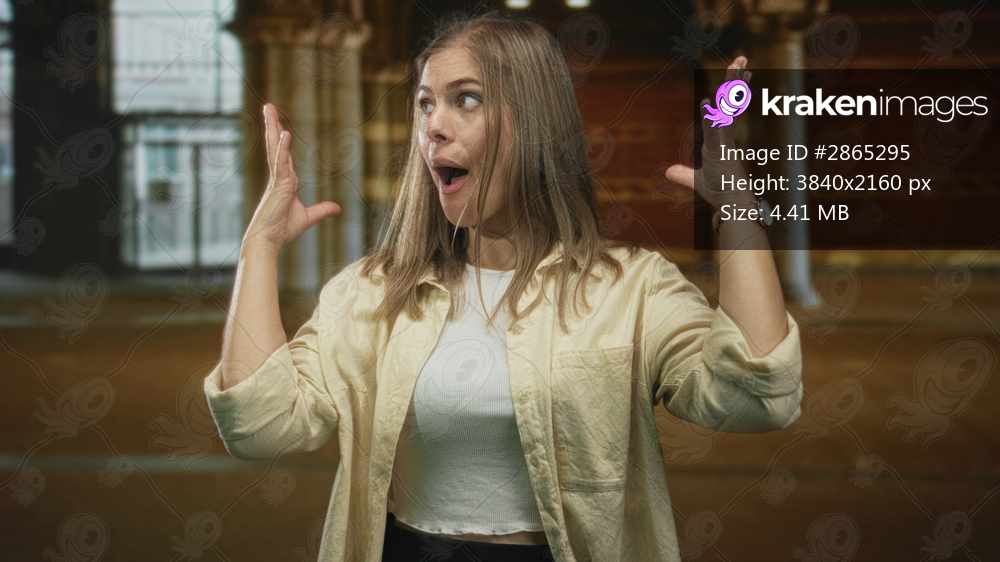 Woman shrugging hands in front of building entrance at dusk with surprised expression and open palms; uncertainty.