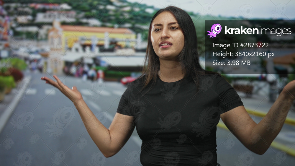 Woman shrugging with hands raised on a street, eyes closed and mouth slightly open; resignation waiting.