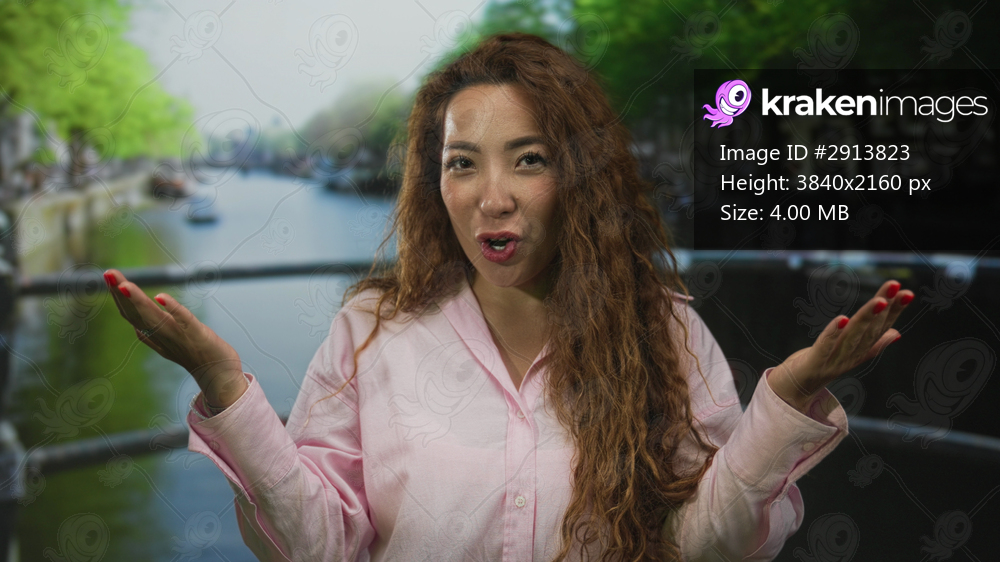 Woman shrugging with hands raised, red nails and long curly hair, wearing pink shirt on street by amsterdam canal bridge; gratitude connection.