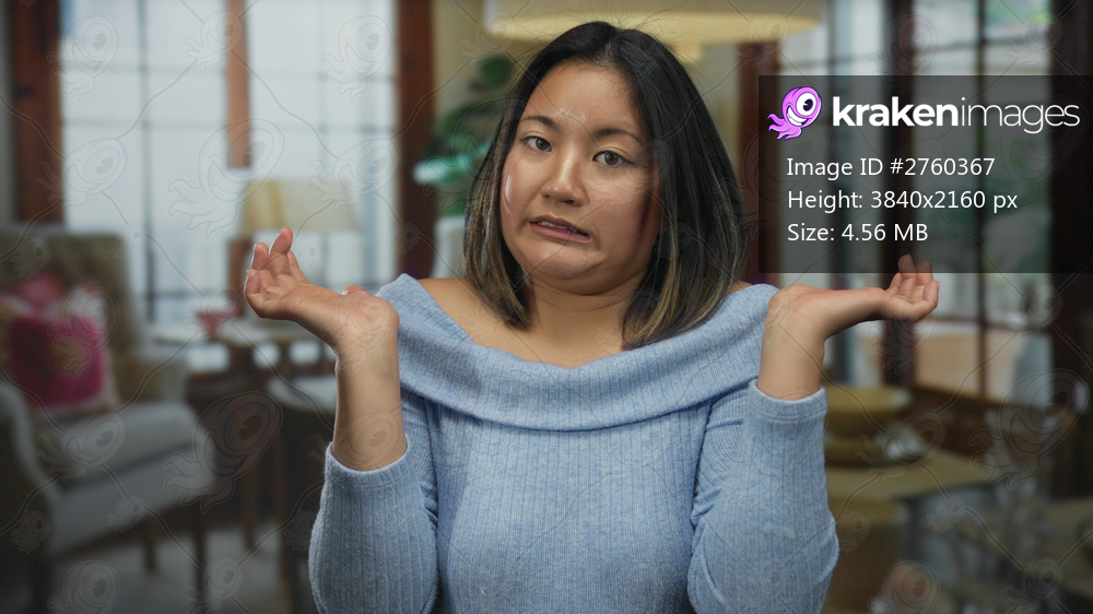 Woman shrugging in a cozy hotel room with large windows and stylish interior exuding a relaxed ambiance with natural light filtering through.
