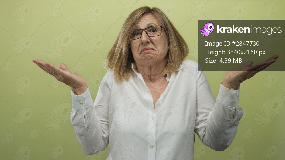 Woman shrugging in studio setting against green backdrop with raised hands and puzzled expression; uncertainty.