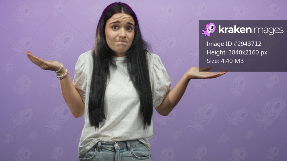 Woman shrugging with open palms in studio wearing white t-shirt and denim jeans, long dark hair and bracelets visible; uncertainty questioning.