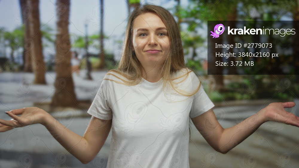 Woman shrugging outdoors in a park with a neutral expression, wearing a white t-shirt, surrounded by green trees and a concrete path under a sunny sky. - Kraken Images