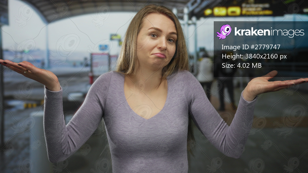 Woman shrugging outdoors in airport environment with people and buildings in background suggesting confusion or uncertainty in travel setting.