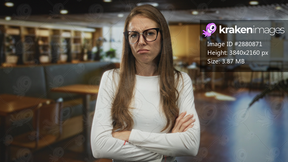 Woman shrugging with palms up and arms crossed in a building, wearing glasses and white top; annoyance.