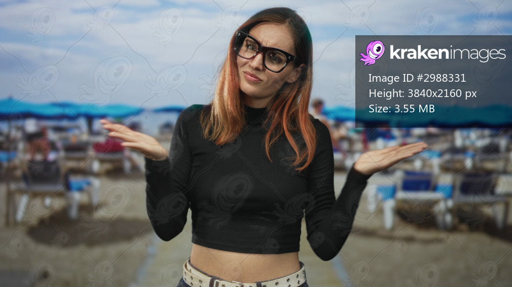 Woman shrugging with palms up, hands visible, wearing black crop top and glasses, at studio; mild uncertainty.