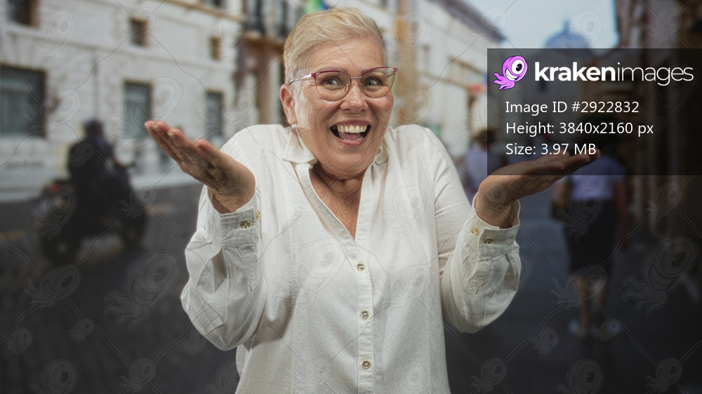 Woman shrugging with palms up on a cobblestone street wearing a white shirt and glasses; unexpected joy.