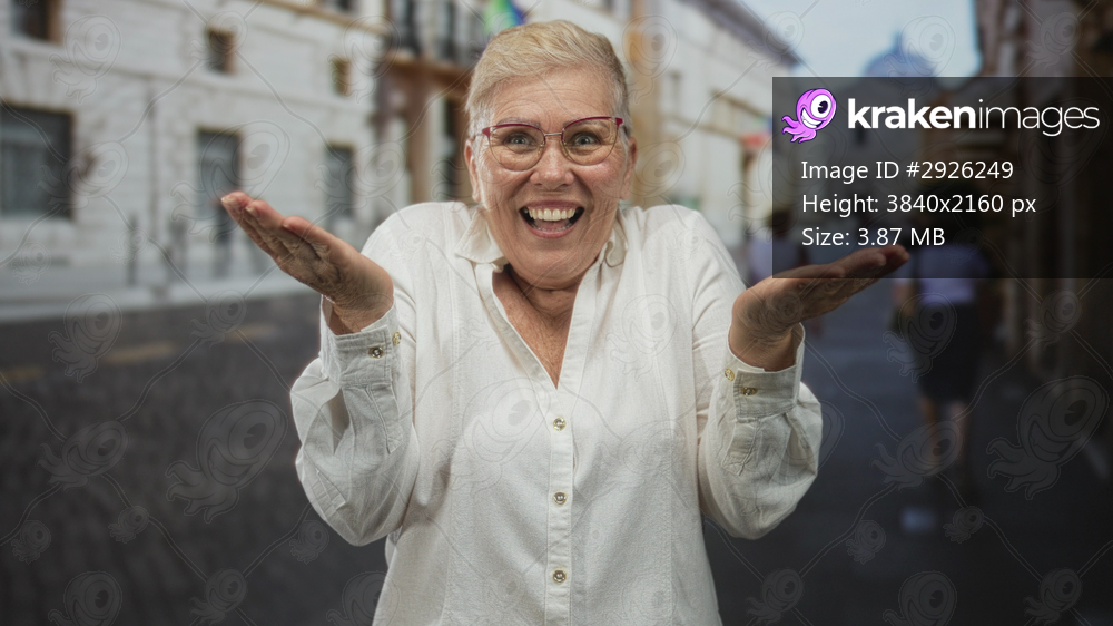 Woman shrugging with palms up on a cobblestone street wearing a white shirt and glasses; unexpected joy.