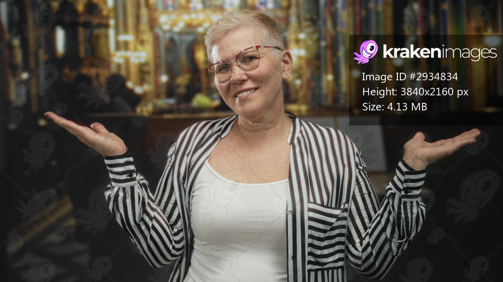 Woman shrugging with palms up and open hands in church interior, smiling and tilting head in front of altar; lighthearted acceptance.