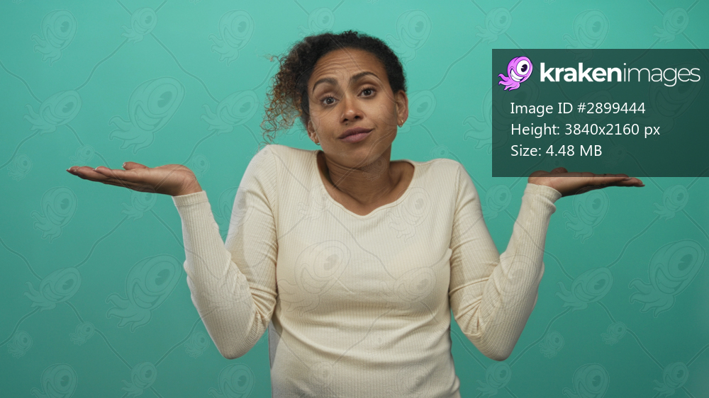 Woman shrugging with palms up and raised shoulders in teal studio, neutral expression; uncertainty decision dilemma.