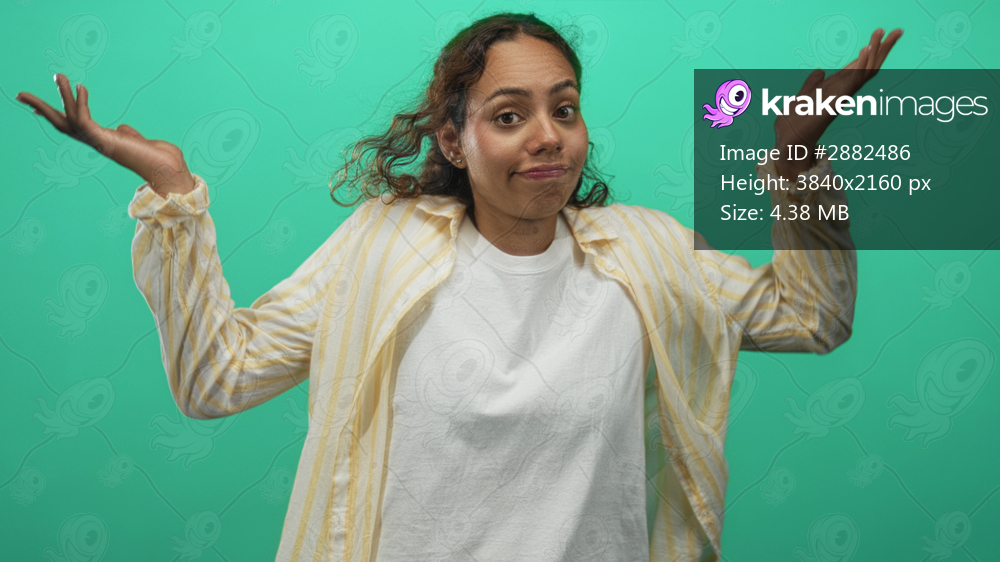 Woman shrugging with palms up and raised shoulders, wearing yellow striped shirt and white tee in green studio; uncertainty.