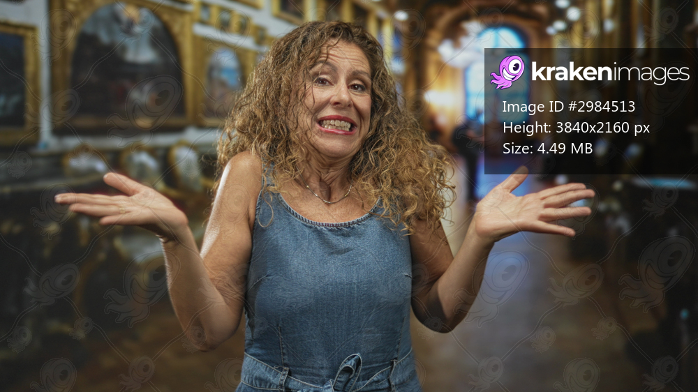 Woman shrugging with palms up showing hands and forearms in ornate gallery building wearing denim dress and necklace with curly hair and awkward smile; playful confusion. - Kraken Images