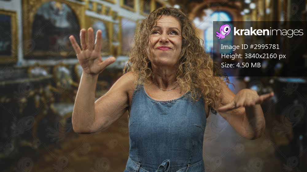 Woman shrugging with palms up showing hands and forearms in ornate gallery building wearing denim dress and necklace with curly hair and awkward smile; playful confusion. - Kraken Images