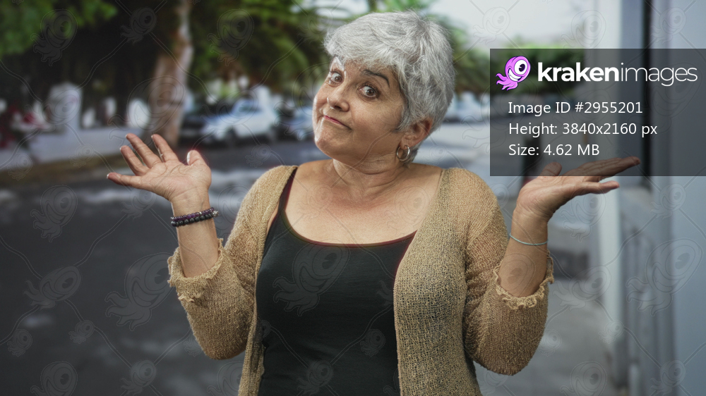 Woman shrugging with palms up and visible hands on a residential street, grey hair and casual cardigan; bemusement doubt.