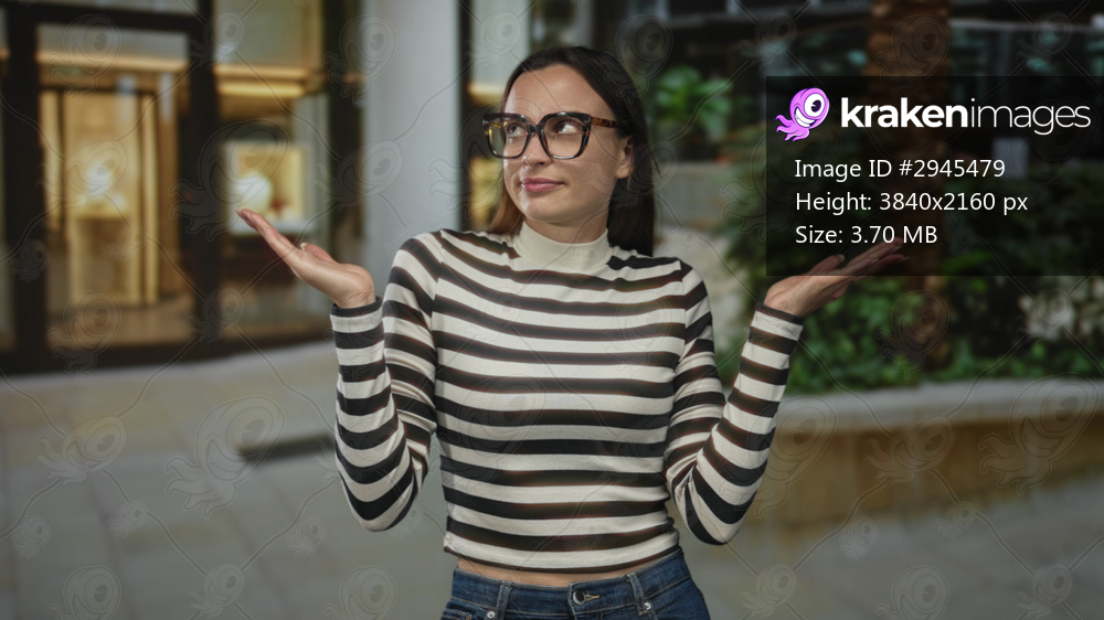Woman shrugging with palms up, wearing glasses and striped sweater in front of a building storefront on street; uncertainty decision.