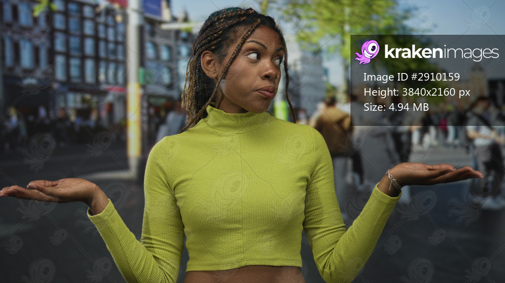 Woman shrugging with palms up wearing lime green crop top showing bare stomach on busy street amid pedestrians; uncertainty doubt.