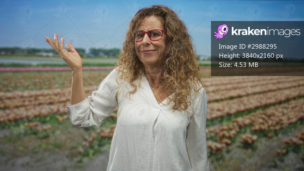 Woman shrugging with raised hand and palm up amid tulip field on a farm, wearing white blouse and red glasses; gentle bemusement.
