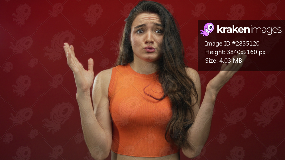 Woman shrugging with raised hands in orange crop top against red studio background; uncertainty doubt.
